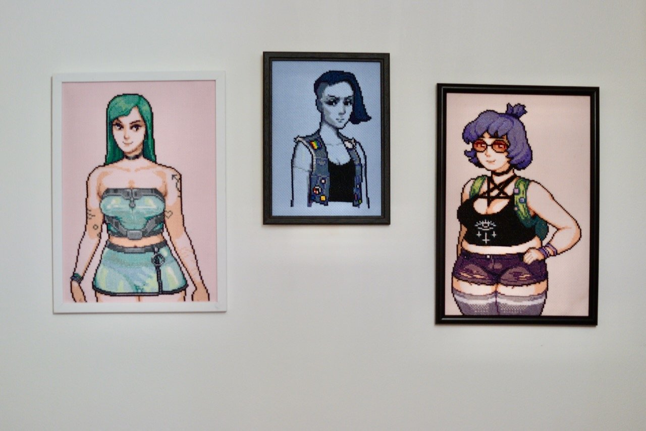 Broderie au point de croix, 2025. Portrait de HC, héroïne du jeu vidéo Hardcoded créé par Kenzie Wintermelon et Trix Royale.